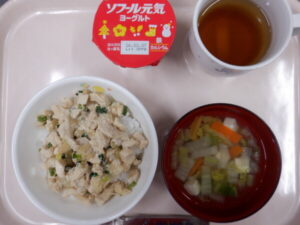 今日の給食は、 鶏肉の生姜焼き丼 キャベツの納豆和え すまし汁 フルーツ(りんご) です。