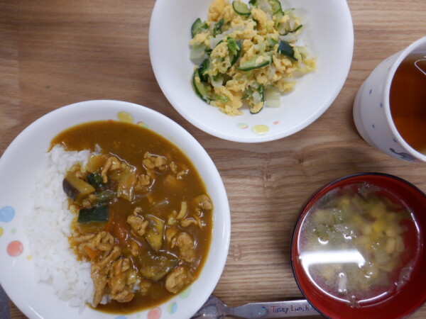 今日の給食は、夏野菜カレー 白菜と卵のサラダ レタスのスープ です。