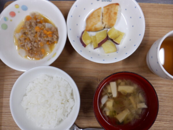今日の給食は、 ごはん カレイのみそ漬け焼き 付け合せ(さつま芋) 大根のそぼろあんかけ すまし汁 です。
