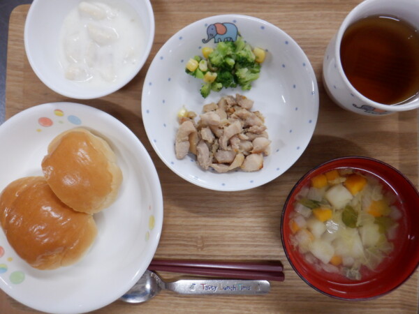 今日の給食は、 ロールパン 鶏肉のマーマレード焼き 付け合せ(ブロッコリー、コーン) ポテコロスープ バナナヨーグルト です。