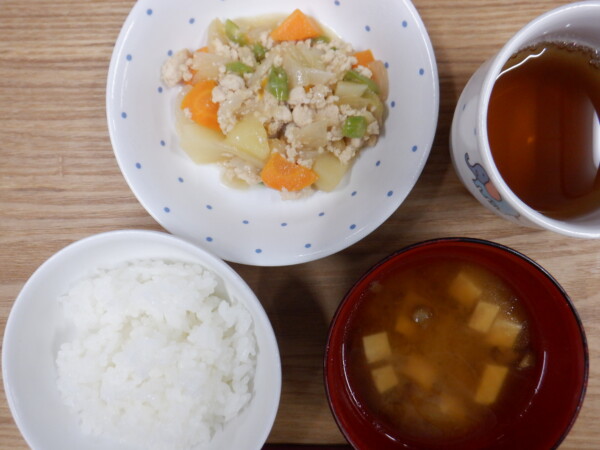今日の給食は、 ごはん 鶏ひき肉の肉じゃが なめこ汁 です。