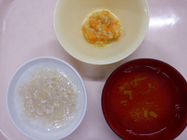 離乳食は、 豚てり丼粥(豚肉、玉ねぎ、白菜) うえずみ(かぼちゃ) 野菜の和え物(キャベツ、人参、さつまいも) です。