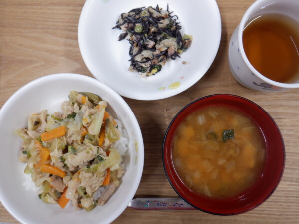 今日の給食は、 鶏てり丼 ひじきの和え物 みそ汁 です。