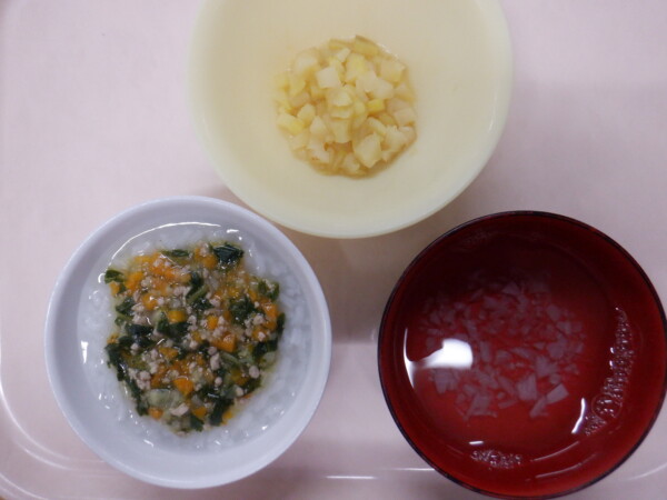 離乳食は、豚肉と白菜のあんかけ粥(豚肉、白菜、人参、チンゲン菜) うわずみ(玉ねぎ) さつま芋の甘煮(さつま芋、じゃが芋) です。