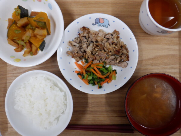 今日の給食は、ごはん 豚肉の南部焼き かぼちゃの煮物 みそ汁 です。