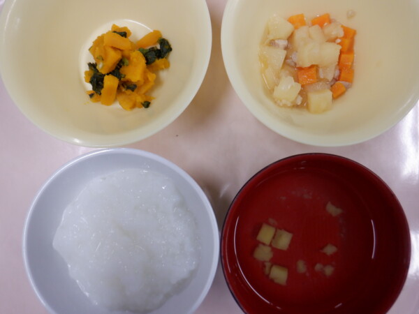 離乳食は、 全粥 うわずみ(さつまいも) 鶏じゃが(鶏肉、玉ねぎ、じゃが芋、人参) 炒め煮(かぼちゃ、小松菜) です。