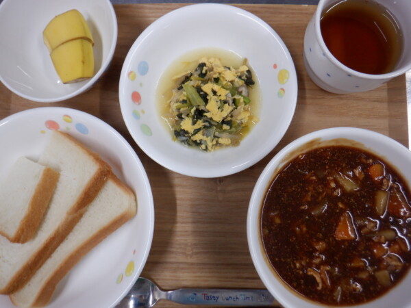 今日の給食は、 食パン ブラウンシチュー 小松菜の卵炒め フルーツ(バナナ) です。