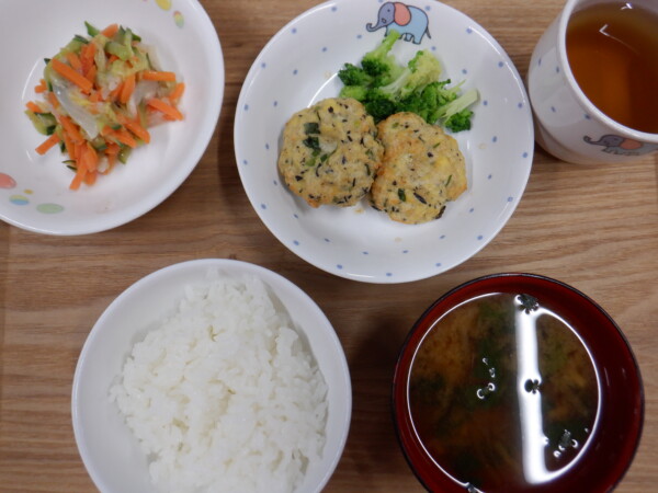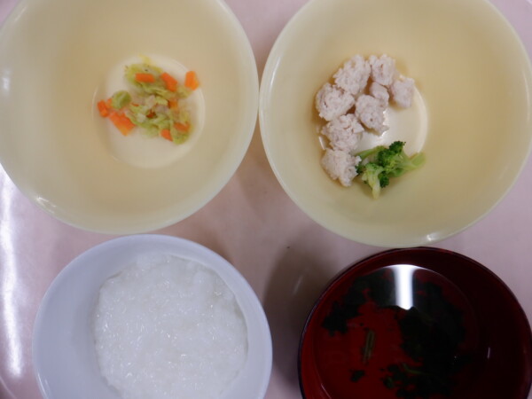 離乳食は、 全粥 うわずみ(ほうれん草) ハンバーグ風(鶏ひき肉、玉ねぎ) 付け合わせ(ブロッコリー) 野菜サラダ(白菜、人参) です。