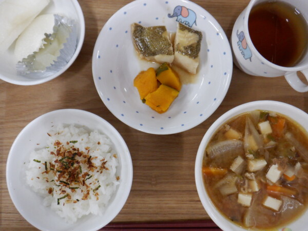 今日の給食は、 ふりかけごはん カレイの生姜醬油煮 付け合せ(かぼちゃ) 豚汁 フルーツ(梨) です。