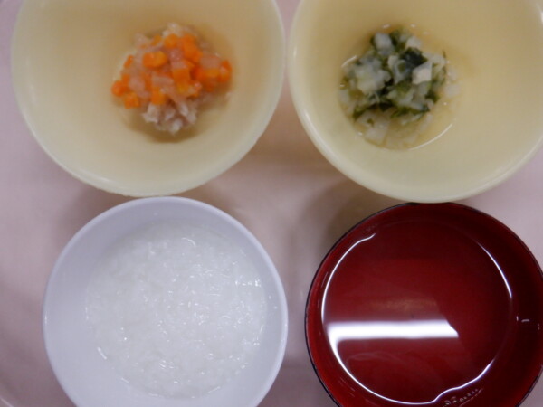 離乳食は、 全粥 うわずみ 魚のあんかけ(タラ、人参、玉ねぎ) 野菜の煮物(キャベツ、白菜、じゃが芋) です。
