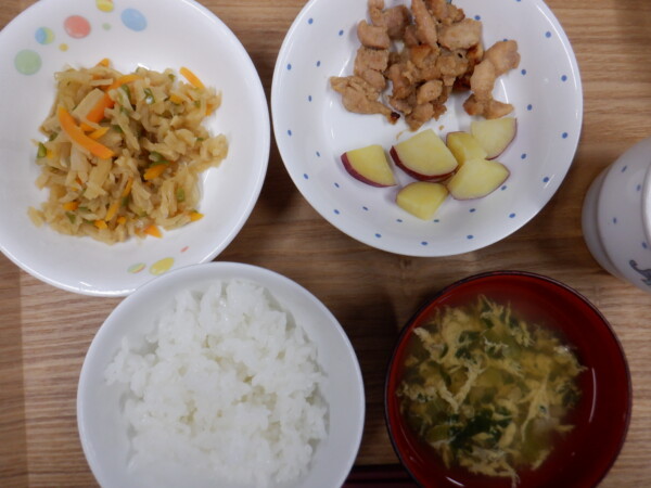 今日の給食は、ごはん 鶏肉のごまみそ焼き 付け合わせ 切干大根のカレー炒め かきたま汁 です。離乳食は、全粥 うわずみ(小松菜) 鶏肉の炒め煮(鶏肉 玉ねぎ さつま芋) 大根の煮物(大根 人参) です。