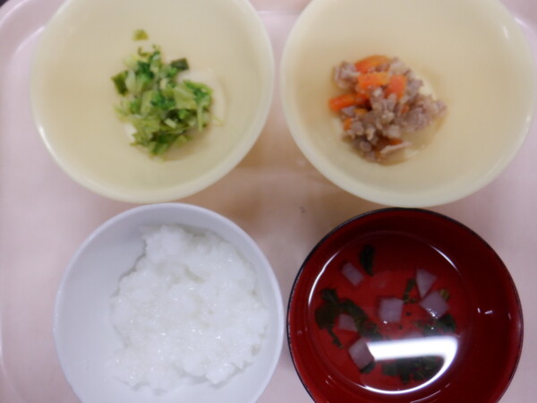 離乳食(後期)は、 全粥 うわずみ(大根、チンゲン菜) 豚肉のソテー(豚肉、玉ねぎ、人参) キャベツサラダ(キャベツ、ブロッコリー) です。