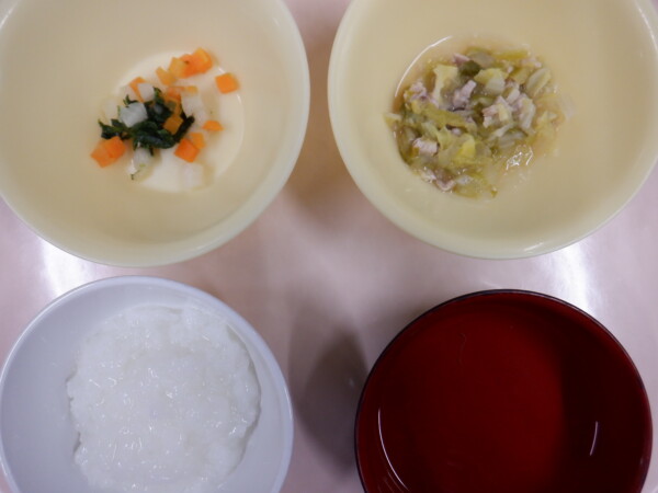 離乳食は、全粥 うわずみ 肉野菜(豚肉、白菜、玉ねぎ) ほうれん草の和え物(ほうれん草、人参、大根) です。