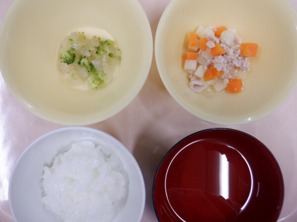 離乳食は、 全粥 うわずみ 豚肉のソテー(豚肉、人参、じゃがいも) 煮込み野菜(ブロッコリー、玉ねぎ) です。