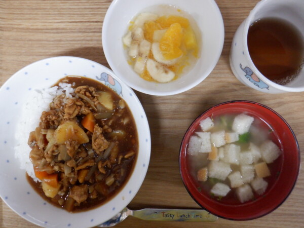 今日の給食は、 ハッシュドポーク オニオングラタンスープ フルーツポンチ です。