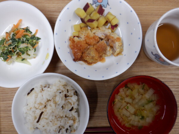 今日の給食は、 塩昆布ごはん チキンみそカツ キャベツのごまドレ和え すまし汁 です。