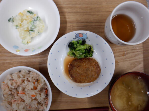 今日の給食は、 鮭ときのこの炊き込みごはん 煮込みハンバーグ ポテコロサラダ みそ汁 です。