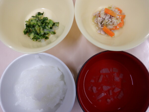 離乳食は、 全粥 うわずみ(玉ねぎ) 豚肉と野菜の煮物(豚もも肉、人参、キャベツ) 中華サラダ風(白菜、大根) です。