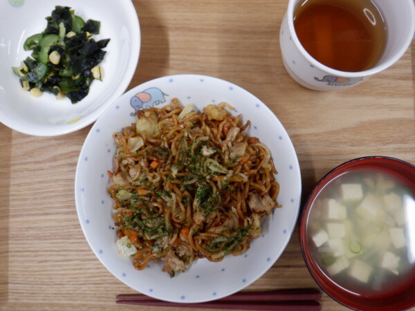 今日の給食は、 焼きそば 中華サラダ 豆腐スープ です。