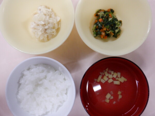 今日の給食は、ごま塩ごはん カレイの煮付け 付け合わせ お浸し 具だくさん汁 です。離乳食は、全粥 うわずみ(さつまいも) タラの煮付け(タラ 玉ねぎ) お浸し(ほうれん草 白菜 人参) です。