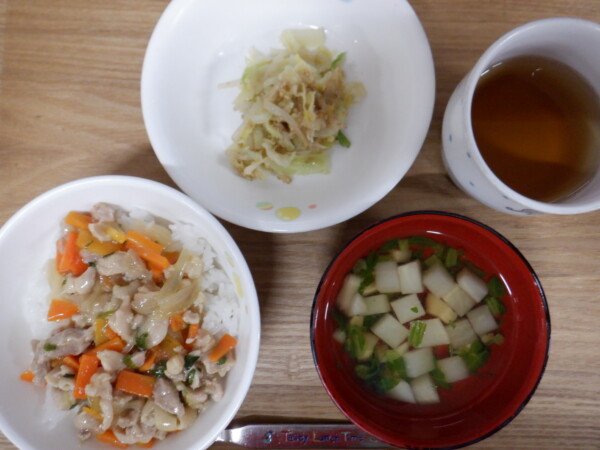 今日の給食は、 鶏肉のねぎみそ丼 キャベツナムル すまし汁 です。