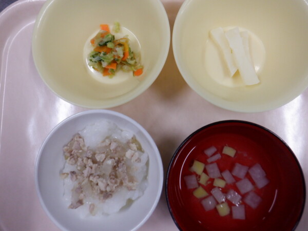 離乳食は、 鶏玉粥(鶏肉、玉ねぎ、全粥) うわずみ(大根、さつま芋) キャベツナムル(キャベツ、人参、白菜) お芋スティック(じゃが芋) です。