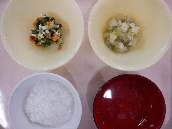 離乳食は、 全粥 うわずみ(玉ねぎ) 魚の煮物(タラ、白菜、じゃが芋) ミックスサラダ(ささみ、人参、ほうれん草) です。