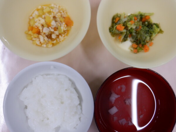 離乳食は、 全粥 うわずみ(じゃが芋) 鶏肉の塩煮(鶏肉、かぼちゃ、さつま芋) ブロッコリーの和え物(ブロッコリー、キャベツ、人参) です。