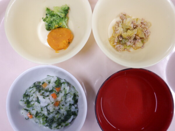 離乳食は、 野菜粥(全粥、ほうれん草、人参) スープ煮(豚ひき肉、キャベツ) かぼちゃのマッシュ(かぼちゃ、ブロッコリー) です。
