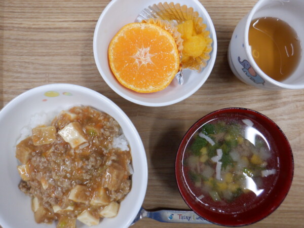 今日の給食は、 厚揚げマーボー丼 みかん かぶのスープ です。