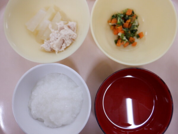 離乳食は、 全粥 うわずみ 白身魚の煮付け(カレイ、鶏ひき肉、じゃがいも、大根) 野菜ナムル(人参、ブロッコリー、白菜) です。