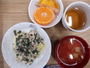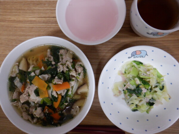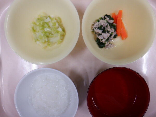 離乳食は、 全粥 うわずみ 豚肉の旨煮(豚肉、人参、ほうれん草) 野菜ソテー(キャベツ、玉ねぎ、じゃが芋) です。