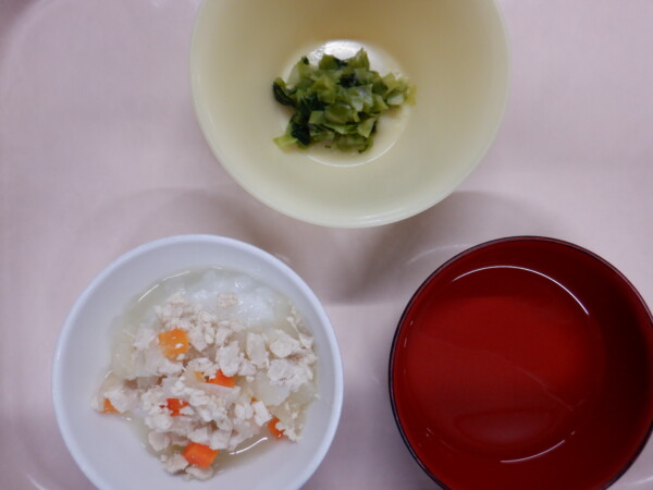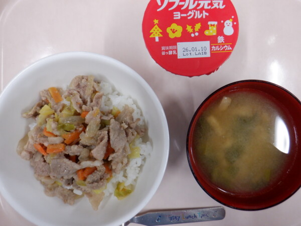 今日の給食は、豚肉の生姜焼き丼 みそ汁 ヨーグルト です。離乳食は、鶏玉粥(全粥 鶏肉 人参 玉ねぎ) うわずみ キャベツの煮物(キャベツ 小松菜) です。