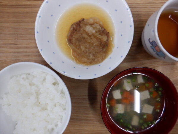 今日の給食は、 ごはん おろしハンバーグ 五目スープ です。