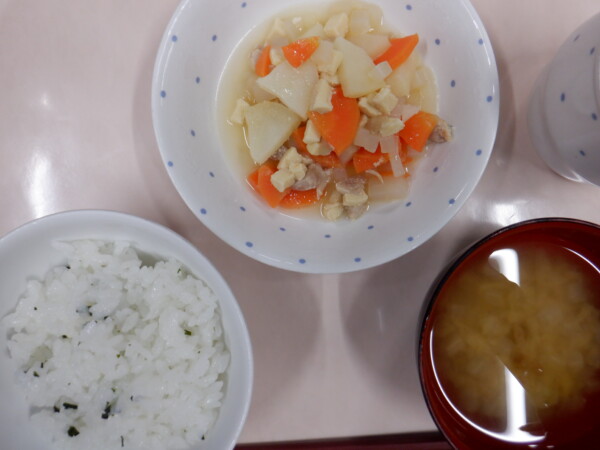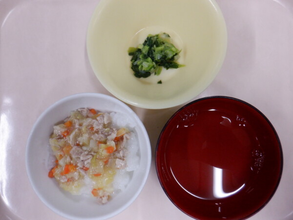 今日の給食は、わかめごはん 田舎煮 みそ汁 です。離乳食は、豚玉粥(全粥 豚肉 人参 キャベツ) うわずみ 白菜の煮物(白菜 小松菜)です。