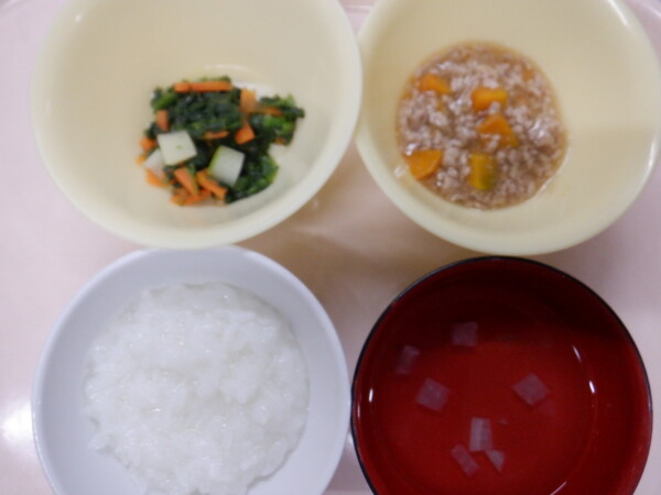 離乳食は、 全粥 うわずみ(大根) かぼちゃのそぼろあんかけ(豚ひき肉、かぼちゃ) 煮浸し(ほうれん草、人参、じゃが芋) です。