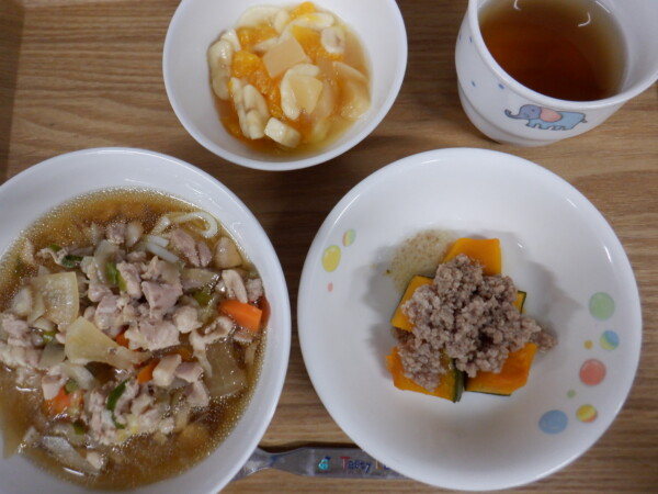 今日の給食は、 けんちんうどん かぼちゃのそぼろあんかけ フルーツミックス です。