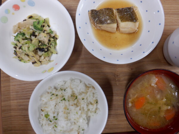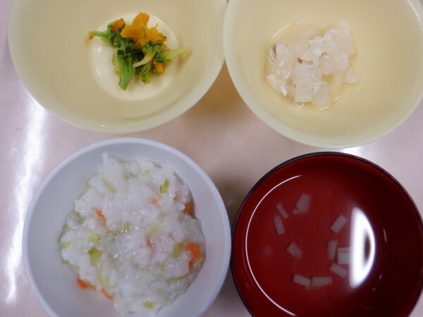 今日の給食は、七草ごはん カレイの煮付け 花野菜のマヨ昆布和え 豚汁 です。離乳食は、彩り粥(全粥 人参 キャベツ) うわずみ(じゃがいも) カレイの煮付け(カレイ 大根) 花野菜サラダ(ブロッコリー かぼちゃ) です。