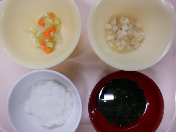 離乳食は、 全粥 うわずみ(ほうれん草) 白身魚のあんかけ(タラ、じゃが芋、大根) コロコロ野菜(キャベツ、人参、玉ねぎ) です。