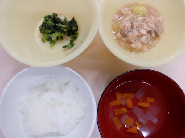 離乳食は、 全粥 うわずみ(人参、大根) 鮭の煮付け(鮭、さつまいも) 白菜のお浸し(白菜、ほうれん草) です。