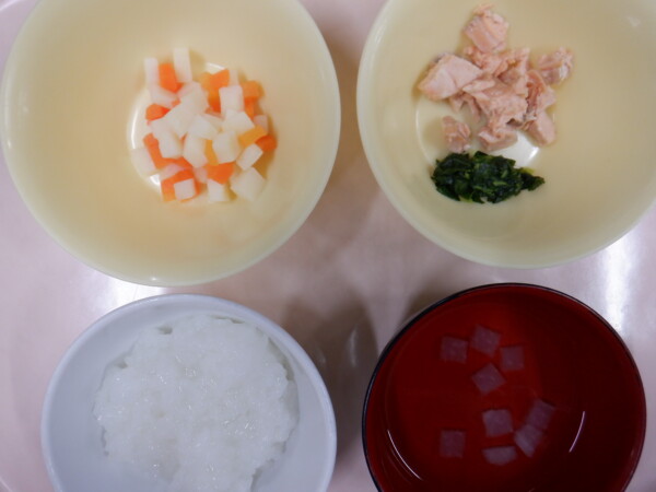 離乳食は、 軟飯 うわずみ 鮭の照り煮(鮭、小松菜、大根) 野菜の炒り煮(人参、じゃが芋) です。