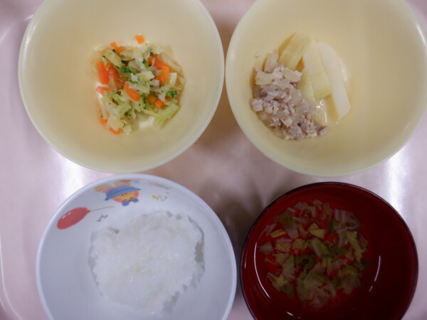 離乳食は、 軟飯 うわずみ(白菜) 鶏肉と根菜の煮物(鶏肉、さつま芋、じゃが芋、玉ねぎ) カラフルサラダ(ブロッコリー、キャベツ、人参) です。