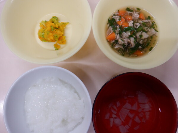 離乳食は、 米飯 うわずみ(玉ねぎ) 豚肉と野菜の煮物(豚肉、チンゲン菜、人参) お浸し(かぼちゃ、ブロッコリー) です。