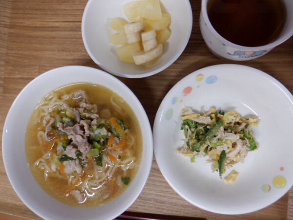 今日の給食は、 しょうゆらーめん バンバンジー パインコンポート です。