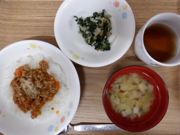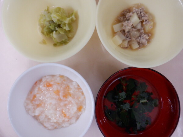 離乳食は、 人参粥(全粥、人参) うわずみ(小松菜) ひき肉の炒め煮(豚ひき肉、大根、じゃがいも) ナムル(キャベツ、玉ねぎ) です。