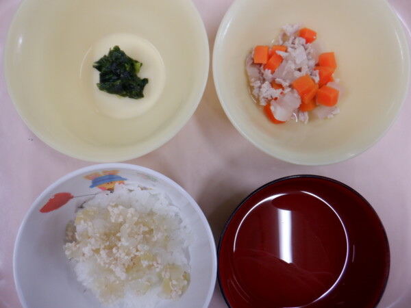 今日の給食は、チキンライス フルーツミックス 具だくさんスープ です。離乳食は、チキン粥(米飯 鶏ひき肉 玉ねぎ) お肉と野菜のスープ煮(豚肉 大根 人参) お浸し(小松菜) です。