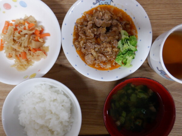 今日の給食は、 ごはん ポークチャップ 切干大根の炒め煮 きのこスープ です。