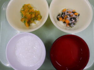 離乳食は、 全粥 うわずみ ひき肉と野菜の旨煮(豚ひき肉、玉ねぎ、人参、小松菜) 和え物(ブロッコリー、かぼちゃ) です。
