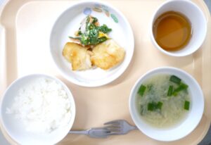 昼食:ごはん、かれいのレモン醬油焼き、菜の花サラダ、みそ汁