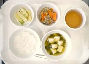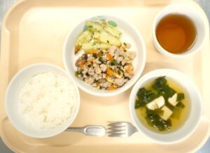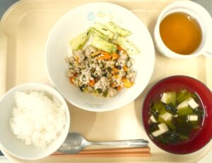 昼食:ごはん、にらそぼろ煮、ベイクドポテト、すまし汁